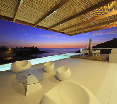 El ingreso al volumen principal se da por el tercer nivel a través de un puente de madera a manera de muelle que atraviesa este y remata en un hall de ingreso que no es más que un mirador al mar que se encuentra suspendido en el centro de una gran doble altura de donde se registra por completo el área social de la casa.